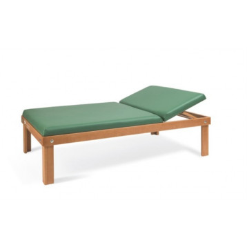 Lettino di grandi dimensioni con schienale regolabile manualmente 0°- 45°. Struttura in legno con piano imbottitura in truciolare, imbottitura in poliuretano densità 25 alta 5 cm. Rivestimento in similpelle lavabile ed autoestinguente classe 1 IM, verniciatura con prodotti all?acqua.