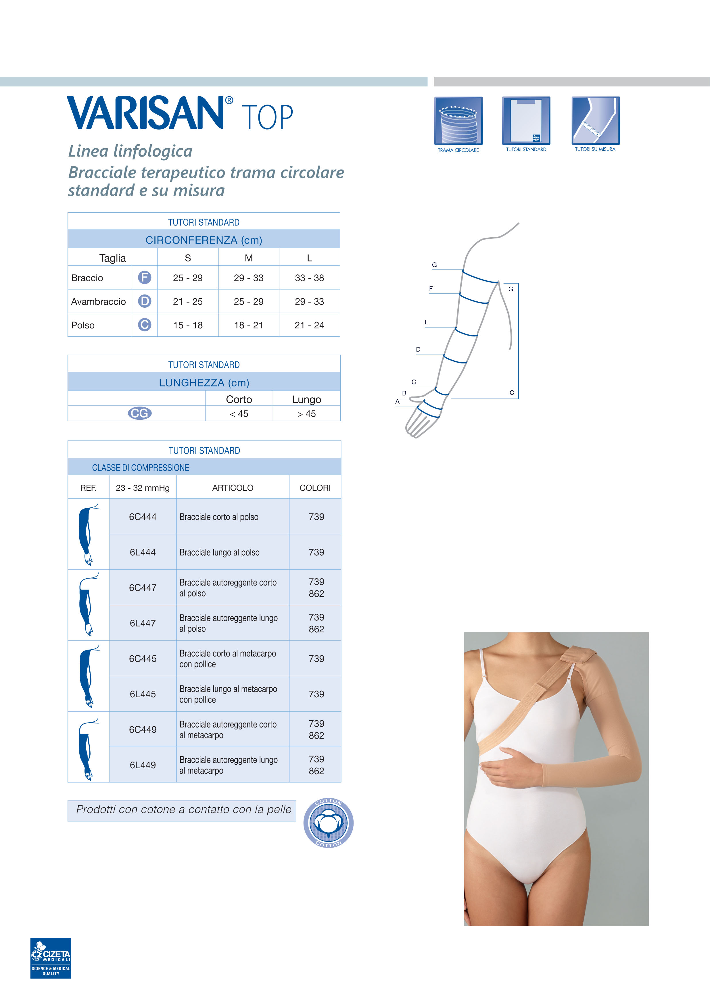 La linea bracciali VARISAN® TOP è realizzata in 3 taglie e 2 lunghezze. Tutti gli articoli di questa linea vengono prodotti anche su misura. Il bordo superiore è siliconato per garantire l’aderenza all’arto. Tutte le referenze hanno il cotone a contatto con la pelle. Disponibile anche la versione con cintura di supporto.