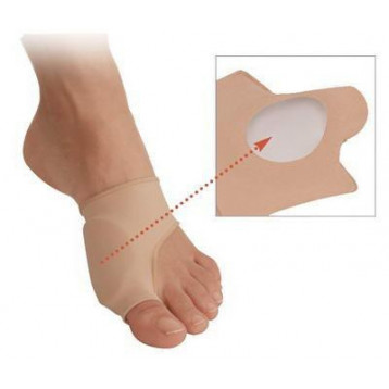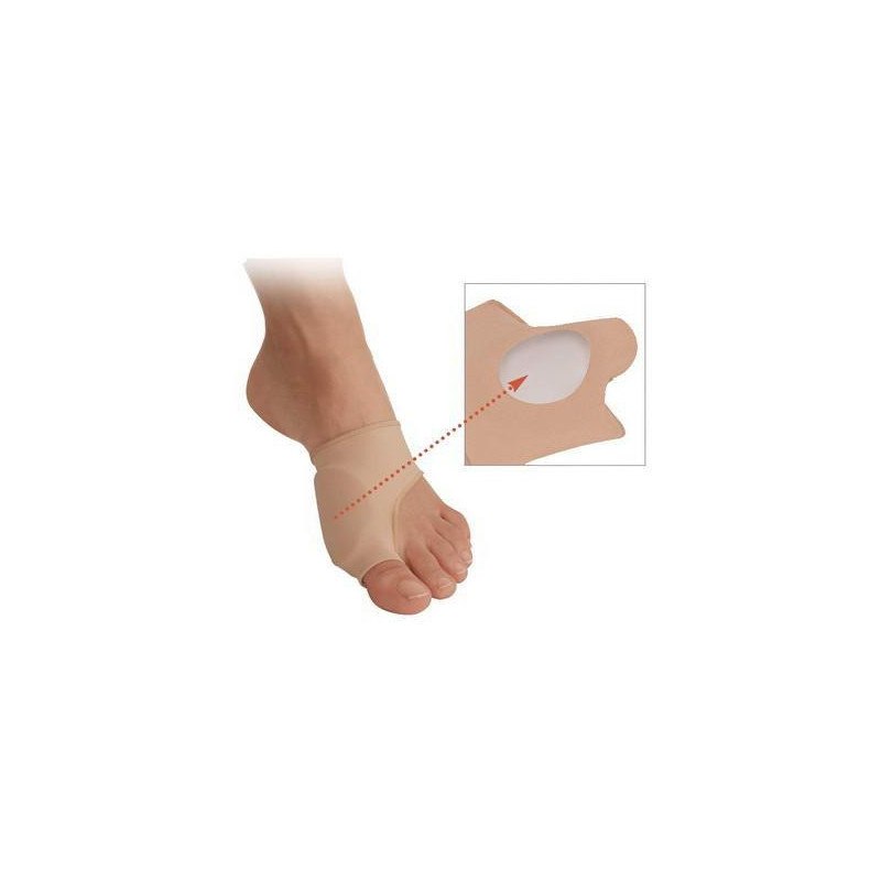 Protezione dell'asostosi del primo metatarso e della sovrastante borsite (alluce valgo). Cuscinetto morbido di gel sottile (3mm) inserito su una leggerissima guaina di tessuto elasticizzato. Il gel va a contatto della pelle, alla quale diffonde il suo olio medicale per proteggerla ed ammorbidirla. Assorbe tutte le forze di pressione e di sfregamento, dando sollievo dal dolore e dall'infiammazione.