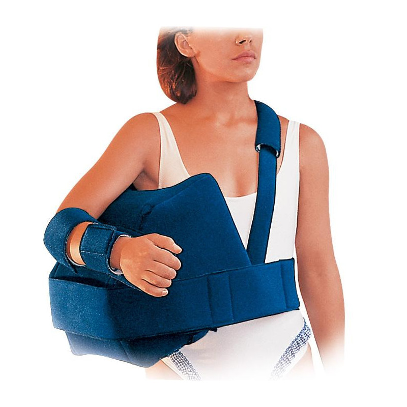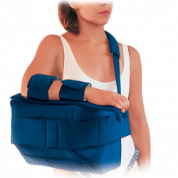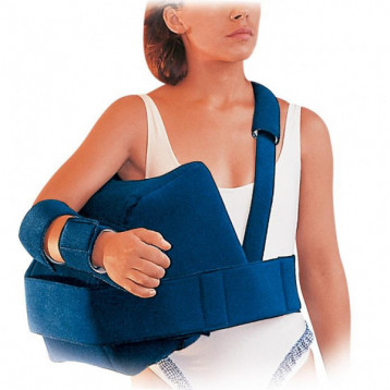 Tutore per abduzione della spalla con cuscino di sostegno in poliuretano rivestito in morbido tessuto, stecca rigida di sostegno polso e mano. Grado di abduzione: 45°- 65°. Favorisce il trattamento riabilitativo. Evita la messa in tensione delle strutture riparate chirurgicamente.