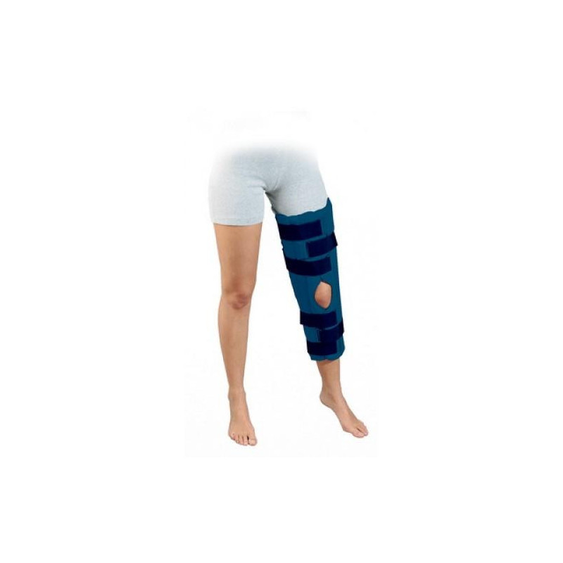 Stecca immobilizzatrice per ginocchio in tessuto stratificato soffice e confortevole. Apertura anteriore, chiusure regolabili in velcro. Per la tutela del ginocchio, in sostituzione del gesso. Munita di due stecche laterali ed una posteriore.Lunghezza 58 cm.