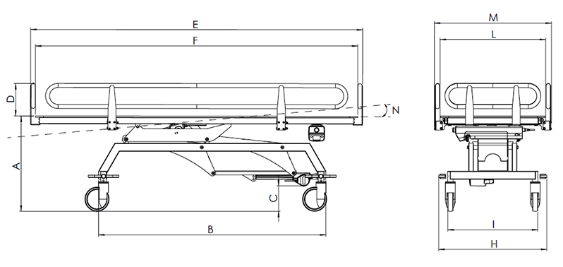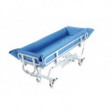 Barella doccia per il lavaggio ed il trasferimento di pazienti, elevabile elettricamente da 59 a 99 cm, con piano di lavaggio inclinabile elettricamente fino a 5° per un corretto drenaggio durante e dopo l'uso. Struttura in acciaio verniciato a polveri, con trattamento antiruggine di derivazione automotive per garantire affidabilità e durata nel tempo. Telo imbottito in PVC rinforzato con poliestere, privo di ftalati, sanificabile. Le ruote ad alto scorrimento, Ø 125 mm, sono dotate di freno a blocco totale. La larghezza contenuta della barella consente una facile movimentazione senza sforzi anche in spazi ristretti. Dotata di sponde ribaltabili di 180° per consentire un facile posizionamento del paziente sulla barella direttamente dal letto e viceversa. Motorizzazione: TiMOTION