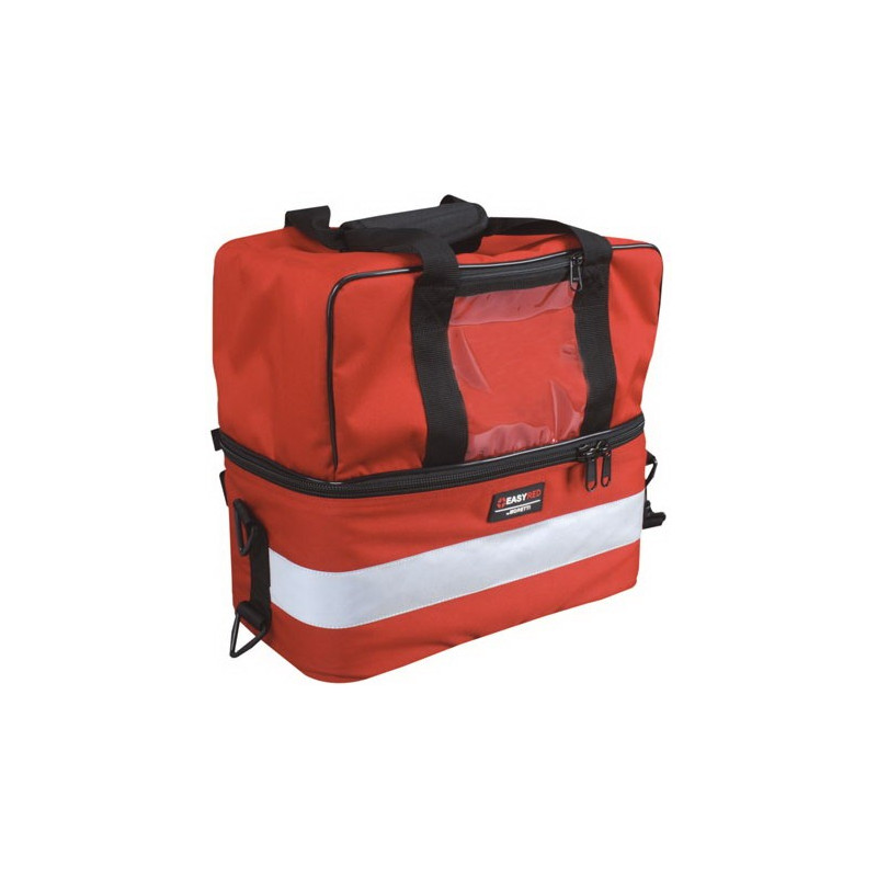 Borsa per emergenza e primo soccorso realizzata in materiale antistrappo a due sezioni. Cerniera a doppia apertura. L'interno e predisposto per l'inserimento delle buste multiuso trasparenti con o senza fissaggio in velcro. Completo di alloggiamenti ad elastici per materiale di piccole dimensioni. Dotato di finestra trasparente sulla parte frontale e sulla parte posteriore per l'inserimento del logo dell'associazione di appartenenza. Trasportabile a mano o a tracolla. Completa di strisce anteriori e laterali in materiale riflettente e piedini di sicurezza antiscivolo.
