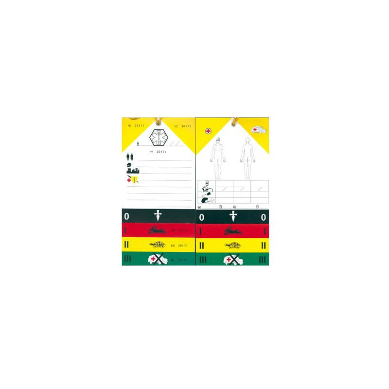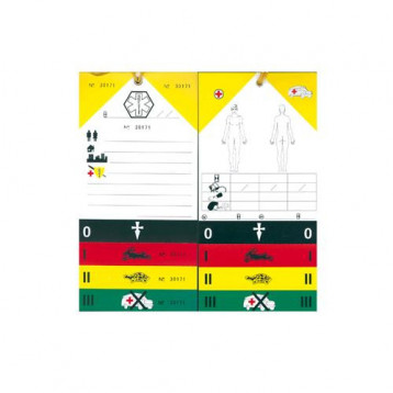 Il cartellino Triage è composto, oltre che dalla parte standard riportante lo stato e la terapia praticata, da 4 talloncini, a strappo perforato, con 4 diverse colorazioni, indicanti la gravità del paziente