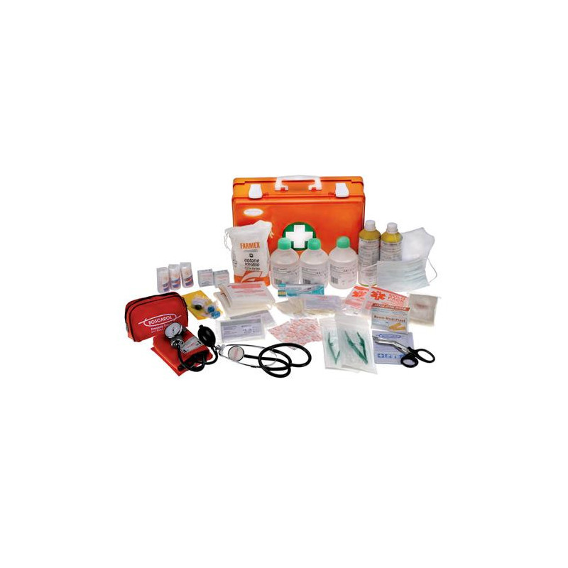 Contenuto conforme al D.M. 388 allegato 1 e D.L. 81 del 09/04/08 art. 45, inclusi sfigmomanometro e stetoscopio: