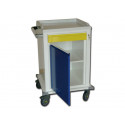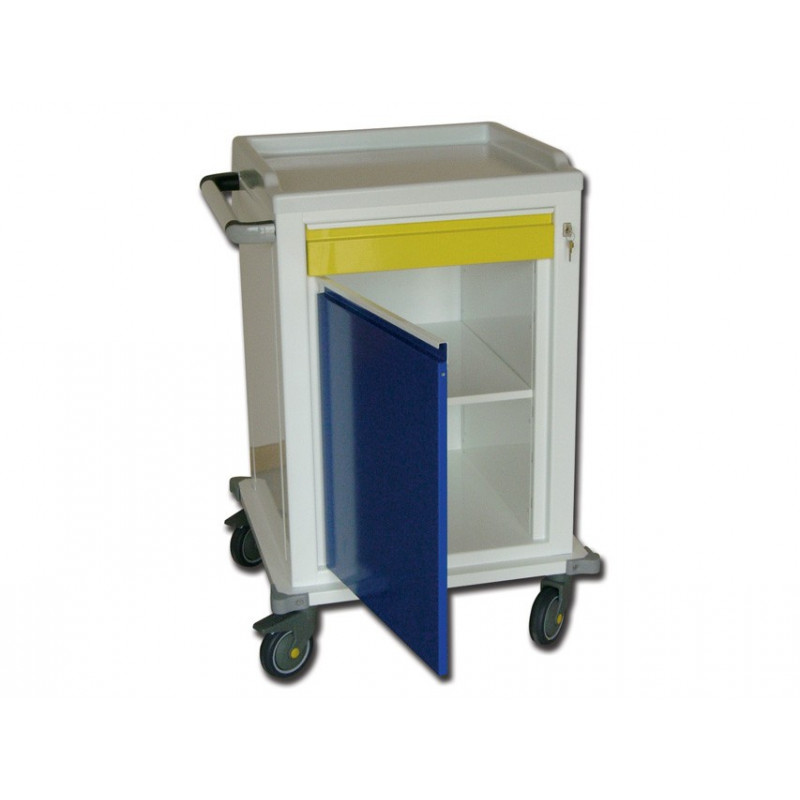 Carrelli modulari in acciao verniciato, struttura autoportante e monoblocco, parte superiore con ampio piano di appoggio in materiale plastico tecnopolimero, realizzato con tre lati di contenimento e senza spigoli vivi per facilitarne la pulizia. Maniglione di spinta ergonomico in tubolare. Parte frontale predisposta con vari cassetti (piccolo giallo, medio blu, grande rosso), a seconda del modello, con pannelli verniciati con polveri epossidiche e maniglia di presa integrata. Scorrevoli su guide a scorrimento silenzioso e munite di fermo corso, con la possibilità di staccare il cassetto dalle guide per facilitarne la pulizia e la disinfezione. Chiusura centralizzata con chiave. Gli accessori possono essere posizionati sul lato destro o sinistro (vani piccoli o grandi e cestino). Provvisto di paracolpi e montato su ruote antistatiche di diametro 125 mm, di cui 2 frenanti. Produzione italiana. Personalizzazione per minimo 10 pz: cassetti in colore personalizzato.