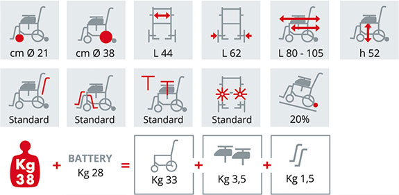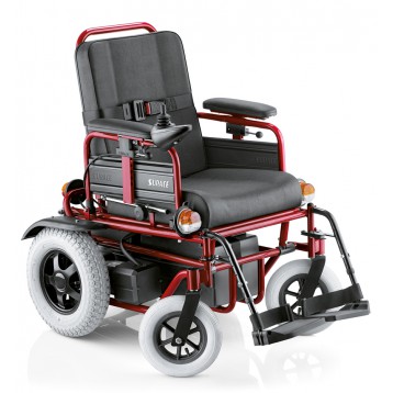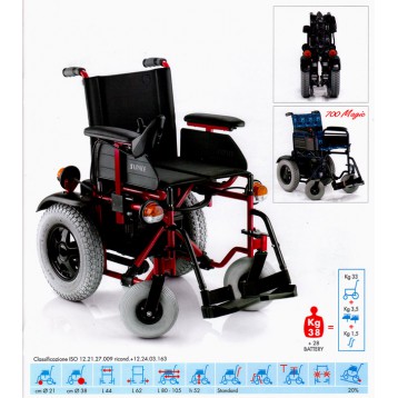 Carrozzina pieghevole a funzionamento elettrico e adatta a spazi interni ed esterni, con motori a presa diretta da 320 watt e batterie 100 A che non richiedono manutenzione e garantiscono una autonomia di 40 km.