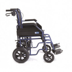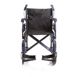 Telaio stabilizzante in acciaio verniciato DOPPIA crociera, seduta e schienale in nylon nero imbottito e lavabile, tasca portadocumenti sul retro. Ruote posteriori (Ø 30 cm), gomme nere in PU. Ruote anteriori nere in PU (Ø 20 cm - spessore 3 cm) con forcella in acciaio. Braccioli corti ribaltabili ed estraibili con imbottitura in PU. Schienale pieghevole, freni operatore. Pedane estraibili regolabili in lunghezza con pedana in plastica nera e cinturino ferma-tallone.