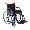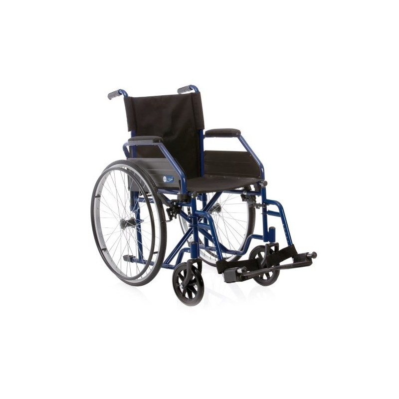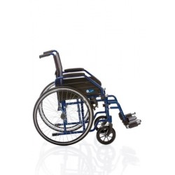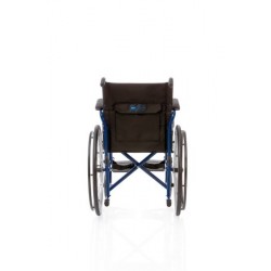 Telaio stabilizzante in acciaio verniciato, crociera singola, seduta e schienale in nylon nero, imbottito e lavabile, tasca portadocumenti sul retro. Ruote posteriori in alluminio a razzi, con gomme nere in PU senza camera d?aria e corrimano in acciaio verniciato nero. Ruote anteriori nere in PVC con forcella in acciaio. Braccioli corti ribaltabili con imbottitura in nylon nero. Pedane estraibili regolabili in lunghezzacon pedana in plastica nera e cinturino ferma-tallone.