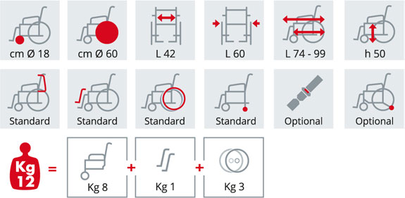 Per migliorare il comfort dell'utilizzatore, S 12 offre svariate opzioni di regolazione. La possibilità di reolare il sedile in altezza e di estrarre facilmente i bracciali e le pedane aiuta il disabile a mantenere una postura corretta, assumere posizioni più comode ed evitare dolori, tensioni muscolari e deformità. Inoltre, le ruote posteriori sono facilmente estraibili per facilitare il trasporto in macchina, è dotata di ruote per ascensore e di comode manopole per permettere all'accompagnatore di spingere la carrozzina e fornire un ulteriore supporto all'utente.
