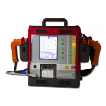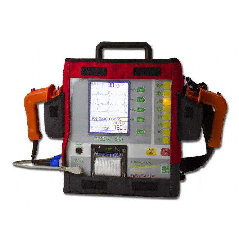 • Display: - Grande (5.7”) alta risoluzione LCD (320x240) - ECG attraverso gli elettrodi (1 traccia), o attraverso 4 cavi ECG (6 tracce): I, II, III, aVR, aVL, aVF • Cambio automatico con l’inserimento del cavo paziente - Filtri: 50Hz/60 Hz linea base - Indicatore frequenza cardiaca • Stampante: - Integrata termica per tracciato ECG e stampa documentazione eventi - Velocità 5, 10, 25, e 50 mm/sec (carta da 58 mm) • Sicurezza: - 2 ripetizioni manuali shock di sicurezza - Isolamento rilevamento ECG classe CF - Scarica interna energia dopo 30 sec. di standby dal caricamento • Alimentazione: - Batterie interne Ni-Cd (tempo di carica al 95% = 2 ore) - Caricatore principale 110/220V, 50/60 Hz • Misure e Peso 34 x 26 x 13 cm • Peso: 5.5 kg • Prodotto Italianoo Dotazione standard: • Batteria interna Ni-Cd • Borsa trasporto• Cavo paziente 4 derivazioni • Placche standard per adulti e bambini • Stampante • 1 rotolo carta • 2 placche riutilizzabili • Adattatore caricatore • Manuale (inglese, italiano) spagnolo e turco su richiesta