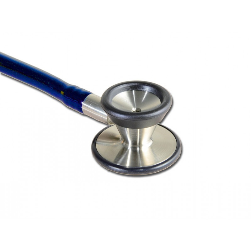 Fonendoscopio professionale dotato di testa in acciaio inox con padiglione piatto amembrana diametro 47 mm per l'auscultazione delle medie ed alte frequenze e padiglione diametro 36 mm, molto profondo ideale per le auscultazioni in cardiologia e pneumologia. Il design moderno, la ghiera anti brivido, nello stesso colore della lira e l'archetto con robusta molla interna in acciaio inossidabile completano le qualità di questo fonendoscopio. Fornito in un'elegante scatola foderata, dotato di tre coppie di auricolari di misure e dimensioni diverse per meglio adattarsi ad ogni utilizzatore. Colore lira: blu Lunghezza lira: 35 cm Diametro lira: 10 mm Diametro padiglione: 36-47 mm