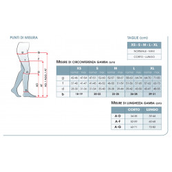 Misurare la circonferenza in caviglia (punto b) per determinare la taglia, verificare che le misure della gamba rientrino nel campo dei valori normali o max. In seguito misurare la lunghezza dalla pianta del piede (punto A) sino al punto superiore della gamba che determina il modello (punti D/F/G) per individuare il tipo "corto" o "lungo".