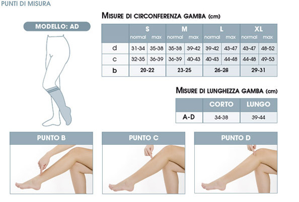 Misurare la circonferenza in caviglia (punto b) per determinare la taglia. Misurare la circonferenza del polpaccio (punto c) e del sottoginocchio (punto d) verificando che le misure della gamba rientrino nel campo dei valori normali o max. In seguito misurare la lunghezza dalla pianta del piede (punto A) fino al sottoginocchio (punto D) per individuare il tipo "corto" o "lungo".