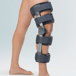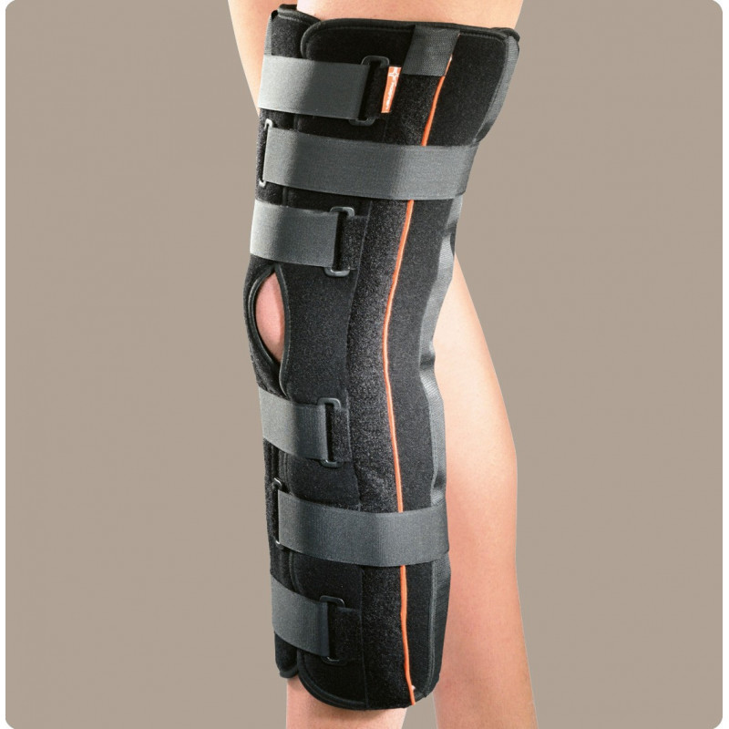 E' un dispositivo medico, leggero e confortevole, che garantisce la corretta posizione dell’articolazione dopo trauma o intervento chirurgico. La struttura a tre pannelli bifoderati (cotone garzato esternamente e spugnetta assorbente internamente) in gommaschiuma a media densità e la capacità contenitiva delle aste modellabili in alluminio assicurano una stabilità articolare paragonabile all’ingessatura. Il sistema di chiusura con cinghie in velcro riduce la migrazione e la rotazione del tutore, il sistema di regolazione ne assicura l’adattabilità a qualsiasi conformazione anatomica, l’apertura patellare e il cuscinetto (removibile) a livello del cavo popliteo offrono il massimo comfort. Di facile rimozione, rende possibile la normale igiene personale.