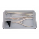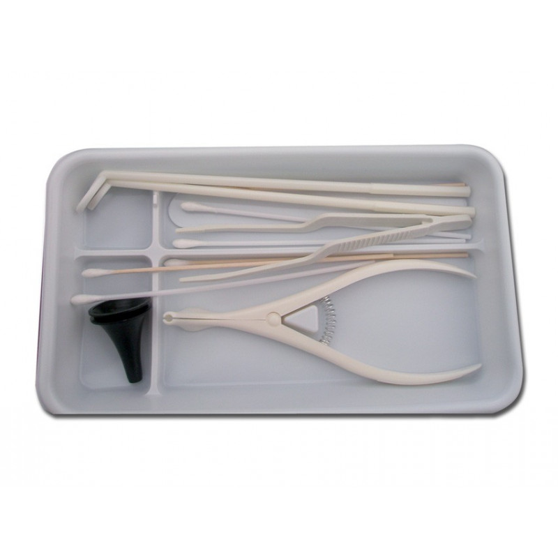 Kit sterile che include uno speculum nasale, un abbassalingua e due speculum auricolari, due specchietti laringei, una pinzetta il tutto in plastica, sei tamponi e una salvietta. Confezionato in una vaschetta in plastica sterile.