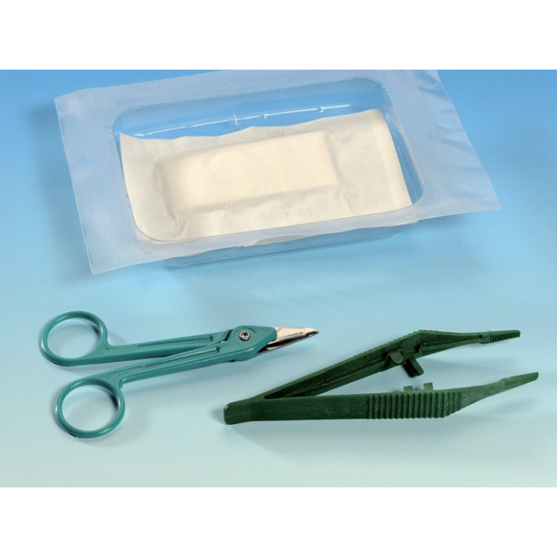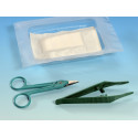 Kit sterile pronto all'uso per la rimozione delle suture chirurgiche. Il set è composto di: una pinza anatomica, forbici Littauer e compresse di garza per la medicazione.