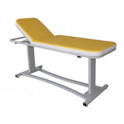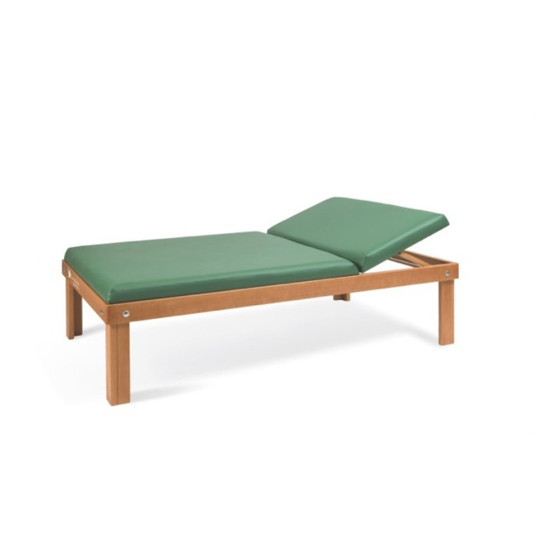 Lettino di grandi dimensioni con schienale regolabile manualmente 0°- 45°. Struttura in legno con piano imbottitura in truciolare, imbottitura in poliuretano densità 25 alta 5 cm. Rivestimento in similpelle lavabile ed autoestinguente classe 1 IM, verniciatura con prodotti all?acqua.