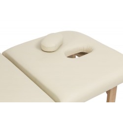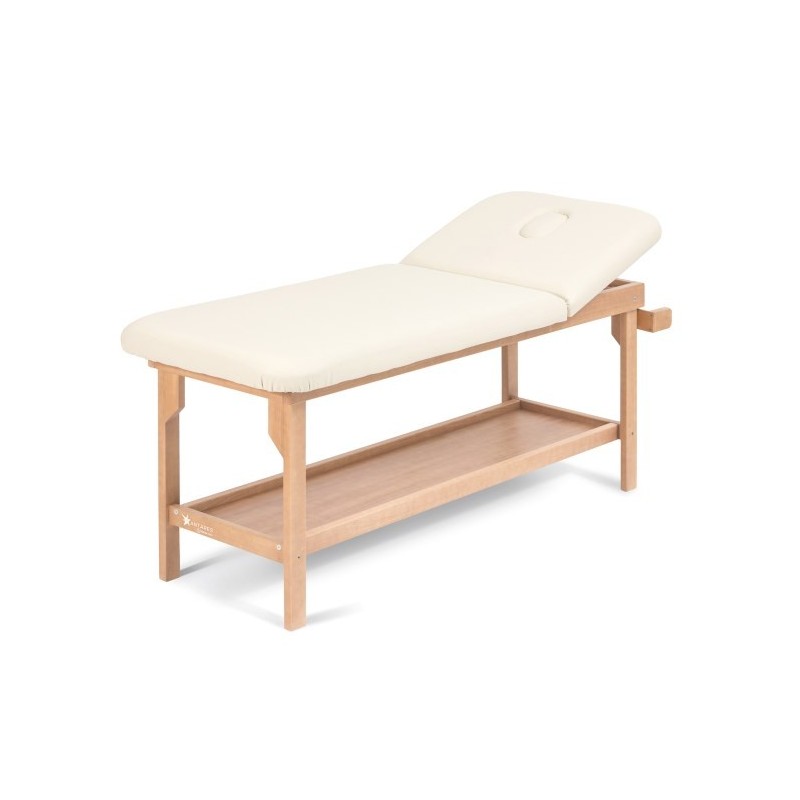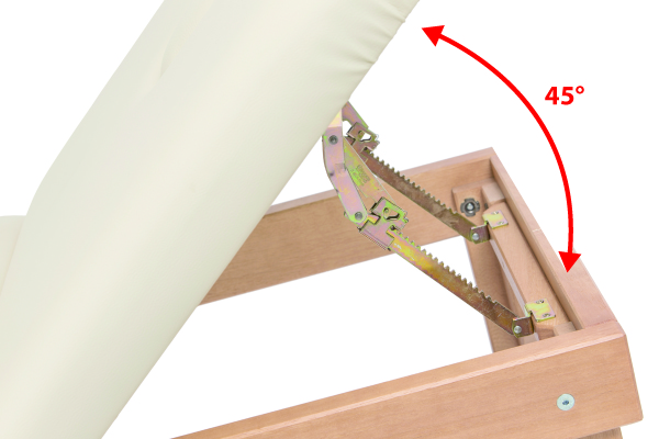 Lettino con schienale regolabile da 0° a 45° con compassi metallici. Struttura in legno con piano imbottitura in legno truciolare, imbottitura in poliuretano densità 25 alta 5 cm. Rivestimento in similpelle lavabile ed autoestinguente classe 1IM, verniciatura con prodotti all?acqua.