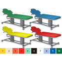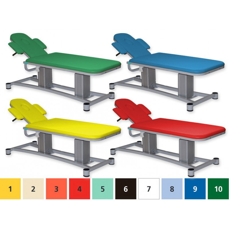 Altezza regolabile mediante due colonne elettriche attivate da una pulsantiera. Ripiano ad alta densità ignifuga Classe 1 IM, imbottito in gomma, ricoperto da materiale in ecopelle.