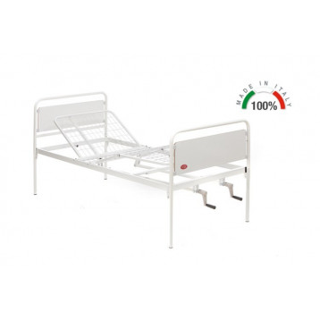 Struttura in tubolare di acciaio 50x20 mm, verniciato a polveri con fondo a rete di acciaio elettrosaldata, adatta ad alloggiare qualsiasi tipo di materasso.Testata e pediera in acciaio verniciato a polveri di facile assemblaggio grazie agli attacchi a baionetta. Pannelli molto robusti in MDF nobilitato da 11 mm facilmente smontabili per pulizia e sanificazione. Alzatesta e alzagambe regolabili indipendentemente con azionamenti a vite e madrevite completamente in acciaio e manovelle ripiegabili a scomparsa.