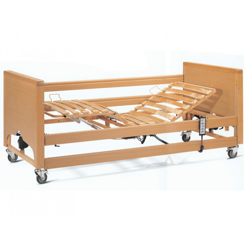 Il telaio del letto da degente è stato interamente saldato ed è composto da moduli in acciaio con sezione 50x25x2 mm rettangolare. La rete del letto è a doghe in legno flessibile che si adatta al corpo del paziente e dispone di guide per il sostegno del materasso. A completare il telaio ci sono poi la testiera e la pediera, con bordi in legno massello, rimovibili secondo le proprie esigenze. La testata del letto si erge a 5 cm dalla rete.