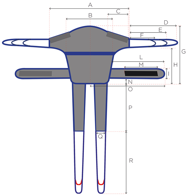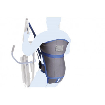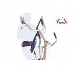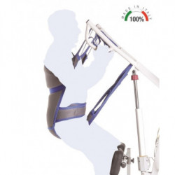 Imbracatura per l'utilizzo con il metti in piedi. Realizzata e cucita interamente in tessuto, nastro e filo 100% poliestere. Il tessuto è antistrappo e altamente traspirante. Il disegno avvolgente per la schiena del paziente, con la cintura addominale a chiusura a velcro e la particolare posizione dei punti di trazione sono stati progettati in modo da dare il maggior sostegno ed il minimo disagio durante l'uso. Inoltre grazie alla trazione nell'area pelvica, anche il paziente meno collaborativo viene sollevato dalla posizione seduta alla posizione eretta senza eccessive pressioni nella zona sottoascellare.