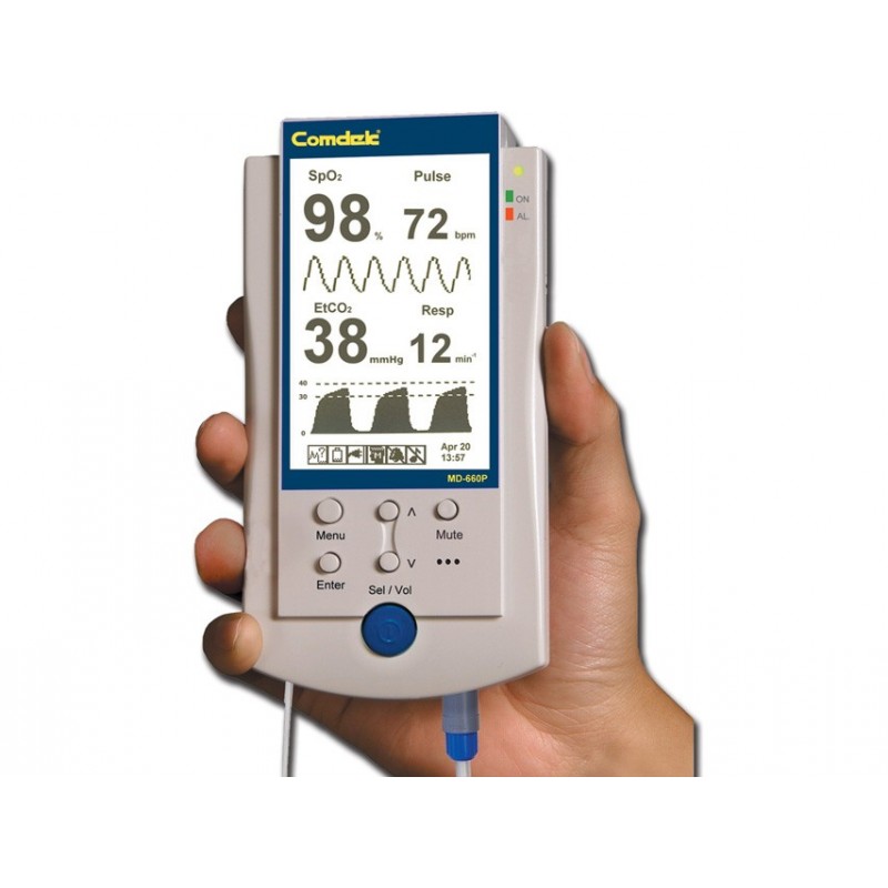 Capnografo multifunzionale portatile che rileva con accuratezza ed affidabilità SpO2, battito, EtCO2, respirazione. Dotato di display retroilluminato indica graficamente SpO2, EtCO2 e funzioni TREND tutti in unica videata. Completo di sensore adulto, adattatore AC, tubo campione, adattatore tubi, filtro, borsa. Collegamento al PC via USB, per analisi dati paziente, statistiche SpO2/Pulsazioni, 4 batterie AA ricaricabili • Memoria di 72 ore con funzionalità trend