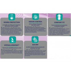 La linea Air dry presenta la caratteristica aggiuntiva della traspirabilità. Questi pannoloni garantiscono una completa assorbenza e un elevato comfort grazie alla speciale forma progettata apposta per aderire al corpo umano. I bordi laterali prevengono la fuoriuscita dei liquidi e le strisce adesive acilitano l'utilizzo e l'indossabilità. La combinazione di ultima generazione di polimeri con una speciale cellulosa (certificata 100% PEFC) garantisce l'assenza di cattivi odori.
