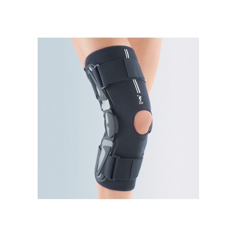 Ginocchiera ortopedica armata con snodo policentrico realizzata in tessuto traspirante con foro rotuleo e cuscinetto stabilizzatore orientabile a 360°. Indicata per chi soffre di instabilità e artrosi del ginocchio, dolore rotuleo o ha subito una lesione meniscale.