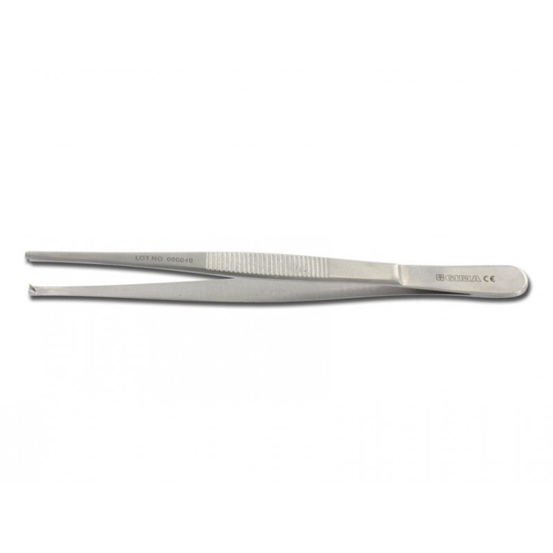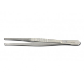 Pinzetta da 12 cm indicata per usi nella dermatologia, realizzata in acciaio inossidabile e caratterizzata da manico zigrinato lievemente e terminazioni a punta finissima.