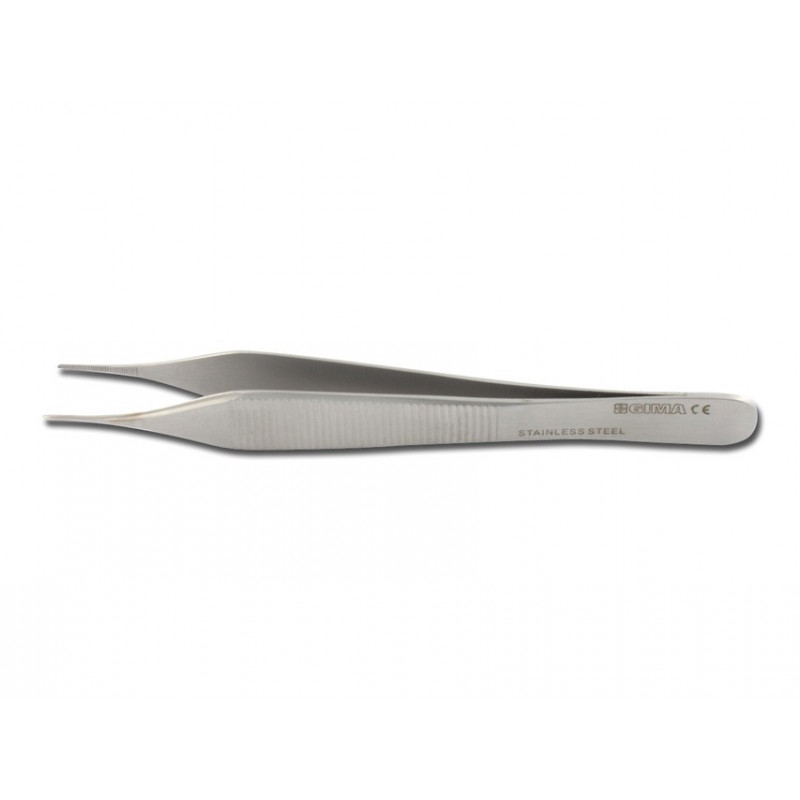 Pinzetta anatomica senza dentatura Adson a punta fine in acciaio inox. Con i suoi 12 cm di lunghezza, la pinza è molto leggera. Si presenta color acciaio grigio opaco.