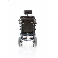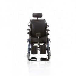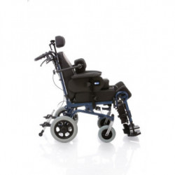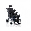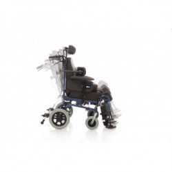 Telaio in acciaio verniciato, seduta e schienale anatomici in poliuretano stampato e rivestiti in nylon nero lavabile. Poggiatesta anatomico in poliuretano stampato rivestito in nylon nero lavabile, regolabile in altezza, profondità ed angolazione. Braccioli e fianchetti imbottiti, estraibili, regolabili in altezza e larghezza. Pedane estraibili, regolabili in larghezza, profondità ed inclinazione con poggiagambe regolabili in altezza dotate di cuscinetti proteggi-ginocchio. Poggiapiedi regolabili in lunghezza. Cuscinetti contenitivi del busto, imbottiti, estraibili, regolabili in altezza, larghezza e angolazione. Divaricatore anatomico imbottito e regolabile. Ruote anteriori in PU Ø 20 cm con forcella in alluminio, regolabili in più posizioni. Ruotini antiribaltamento in dotazione. Maniglione di spinta imbottito, regolabile in altezza completo di comandi operatore.