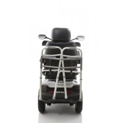Carrozzina pieghevole a funzionamento elettrico e adatta a spazi interni ed esterni, con motori a presa diretta da 320 watt e batterie 100 A che non richiedono manutenzione e garantiscono una autonomia di 40 km.
