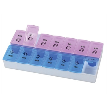 Scatole portapastiglie con slot singoli per ciascun giorno della settimana etichettati con i loro nomi in italiano, vendute in coppia per terapie con doppia assunzione giornaliera e con 2 colori diversi parzialmente trasparenti.