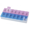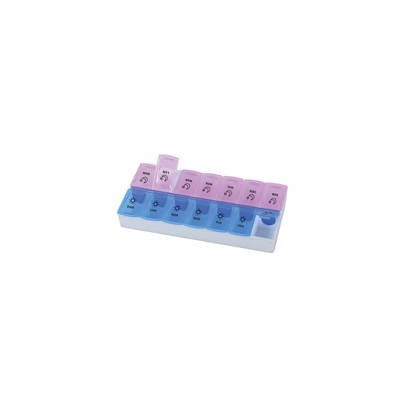Portapillole settimanale con 2 scompartimenti per ciascun giorno in cui sono stampati i nomi dei giorni (abbreviati) in italiano. I 2 scompartimenti porta-pastiglie giornalieri si differenziano l'uno dall'altro per il colore del portapillole e per la presenza su uno di una M stampata e sull'altro di una P, rispettivamente per mattina e pomeriggio.