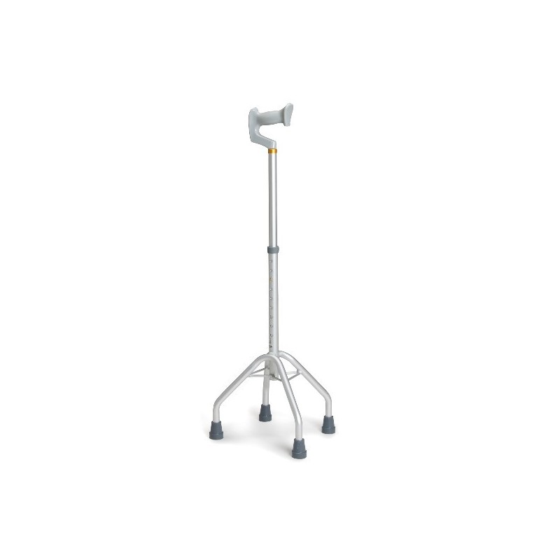 Il modello di quadripode che vi proponiamo è un bastone per anziani e disabili a base larga con puntali antiscivolo. Il quadripode è pensato per essere un sostegno stabile e sicuro per le persone con problemi di equilibrio, debolezza muscolare e difficoltà di deambulazione. La struttura è realizzata interamente in alluminio anodizzato, un materiale molto utilizzato per questo genere di ausili per via della sua leggerezza. Il manico è aperto con impugnatura anatomica. L'altezza del bastone è facilmente regolabile con incrementi da 2,5 cm. Tali caratteristiche permettono di camminare in completa autonomia e senza rischi.