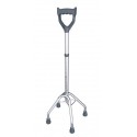 Quadripode con base d'appoggio larga regolabile in altezza. I puntali antiscivolo e il manico chiuso con impugnatura anatomica lo rendono un sostegno sicuro per anziani e disabili che cercano stabilità e hanno bisogno di camminare a passo lento.