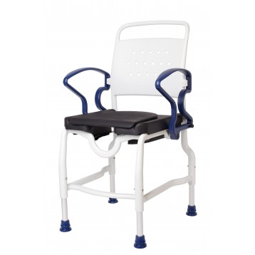 Sedia per la doccia e WC con schienale, braccioli e ruote Sedia per WC e doccia indicata per le pratiche di igiene personale di persone con problemi motori o in alternativa al WC. La morbida imbottitura dello schienale e dei braccioli ribaltabili e le pedane poggiapiedi assicurano stabilità e il massimo comfort. Facilmente trasportabile grazie alle ruote.