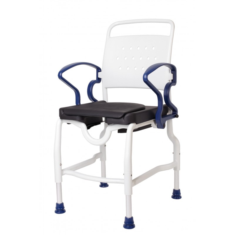 Sedia a rotelle per doccia Carrozzina per disabili da doccia e da bagno realizzata in alluminio anodizzato resistente, con schienale e sedile imbottiti, facile da spostare e con braccioli ribaltabili e poggiapiedi regolabili per massimizzare il comfort del paziente.