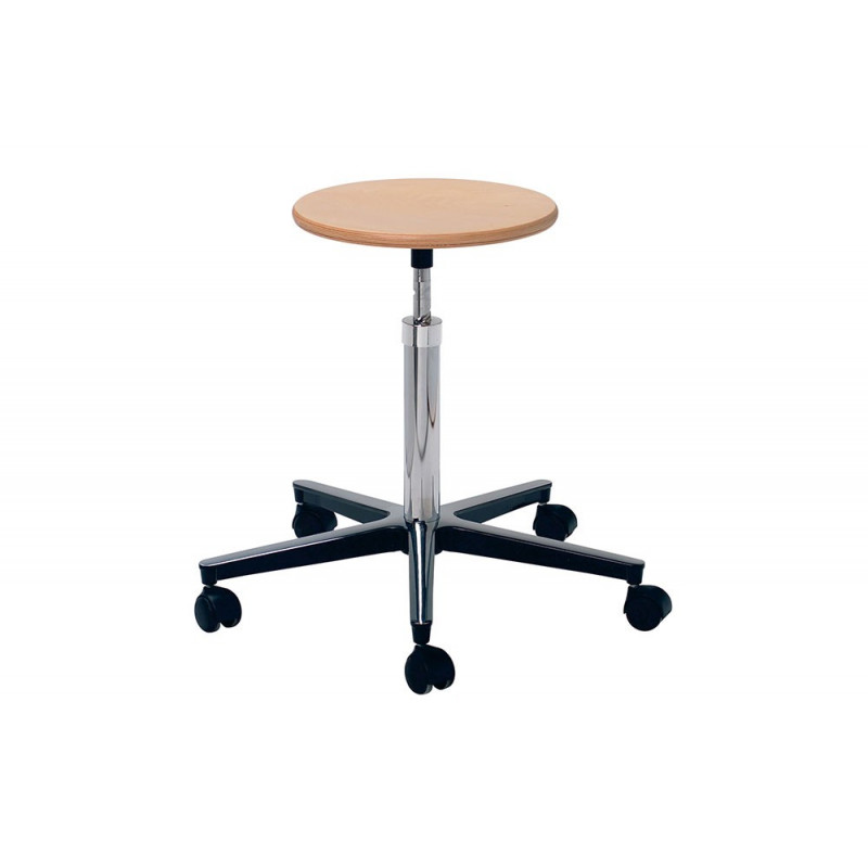 Seduta imbottita in finta pelle, antifiamma, con schienale. Altezza regolabile. Base in