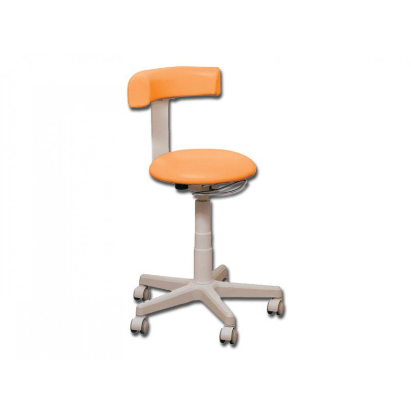 Questo sgabello da ambulatorio non dispone di poggiapiedi e ha una fascia poggiaschiena che permette al paziente di assumere una posizione corretta senza curvare la schiena.