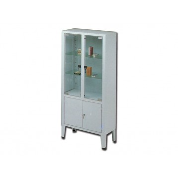 Mobiletto con vetrina dotato di 4 ante di cui 2 in acciaio e 2 in vetro temperato, con 3 ripiani all'interno della vetrina e sistema di chiusura sicuro, perfetto per essere usato in tutti i contesti ambulatoriali e ospedalieri e facile da abbinare con qualsiasi arredamento sanitario.