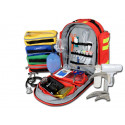 GIMA offre una gamma completa di kit pronto soccorso (valigette in alluminio, borse e zaini cordura) in 8 diverse versioni: ZAINO EMERGENZA “GIMA 10” – pieno. Dotazione standard: • Pallone in silicone con maschera N° 4 in silicone • Maschera pediatrica N° 2 in silicone • 3 cannule Guedel small-medium-large • Apribocca e pinza tiralingua • Tubo atossico per connessione a bombola ossigeno • Laringoscopio con 3 lame Mc-Intosh Inox • Sfigmomanometro palmare aneroide London • Stetoscopio Rappaport • Forbici universali • Aspiratore manuale Res-q-Vac • Pinze Magill • Lucciola • Laccio emostatico GIMA • Coperta d’ emergenza • Medicazione Burn Free 10x10 • 5 borsette colorate